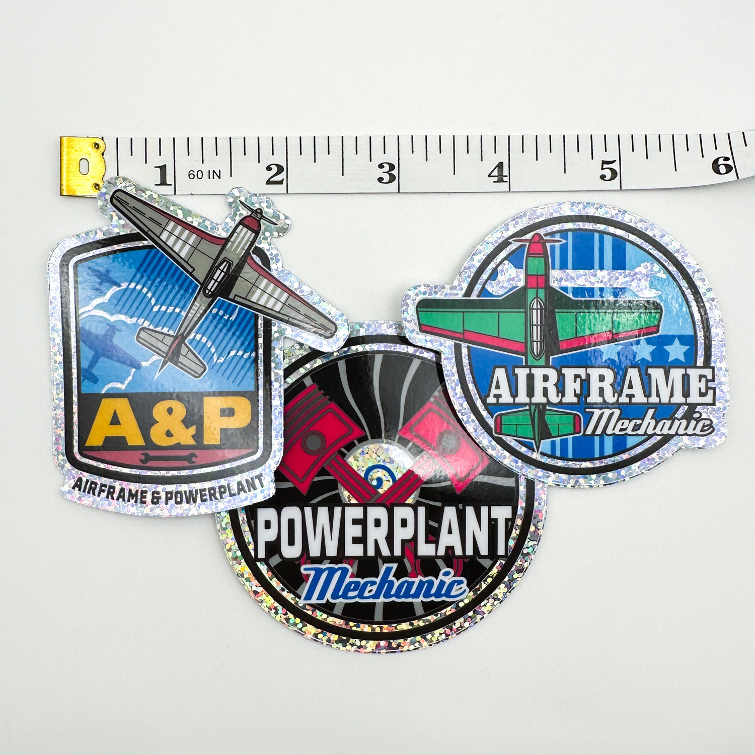 Celebrate passing your last oral and practical, or show off your years of experience as you watch the glitter catch the light on our three retro Airframe and Powerplant stickers. You know your toolbox wants some bling...
