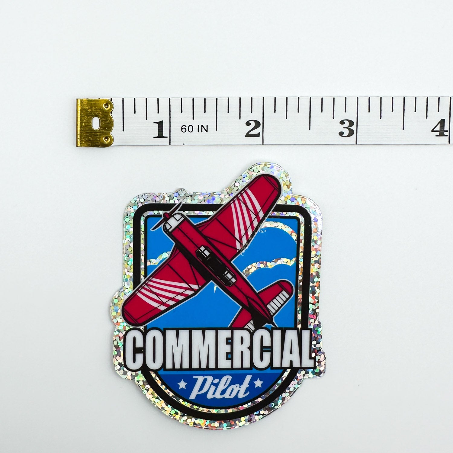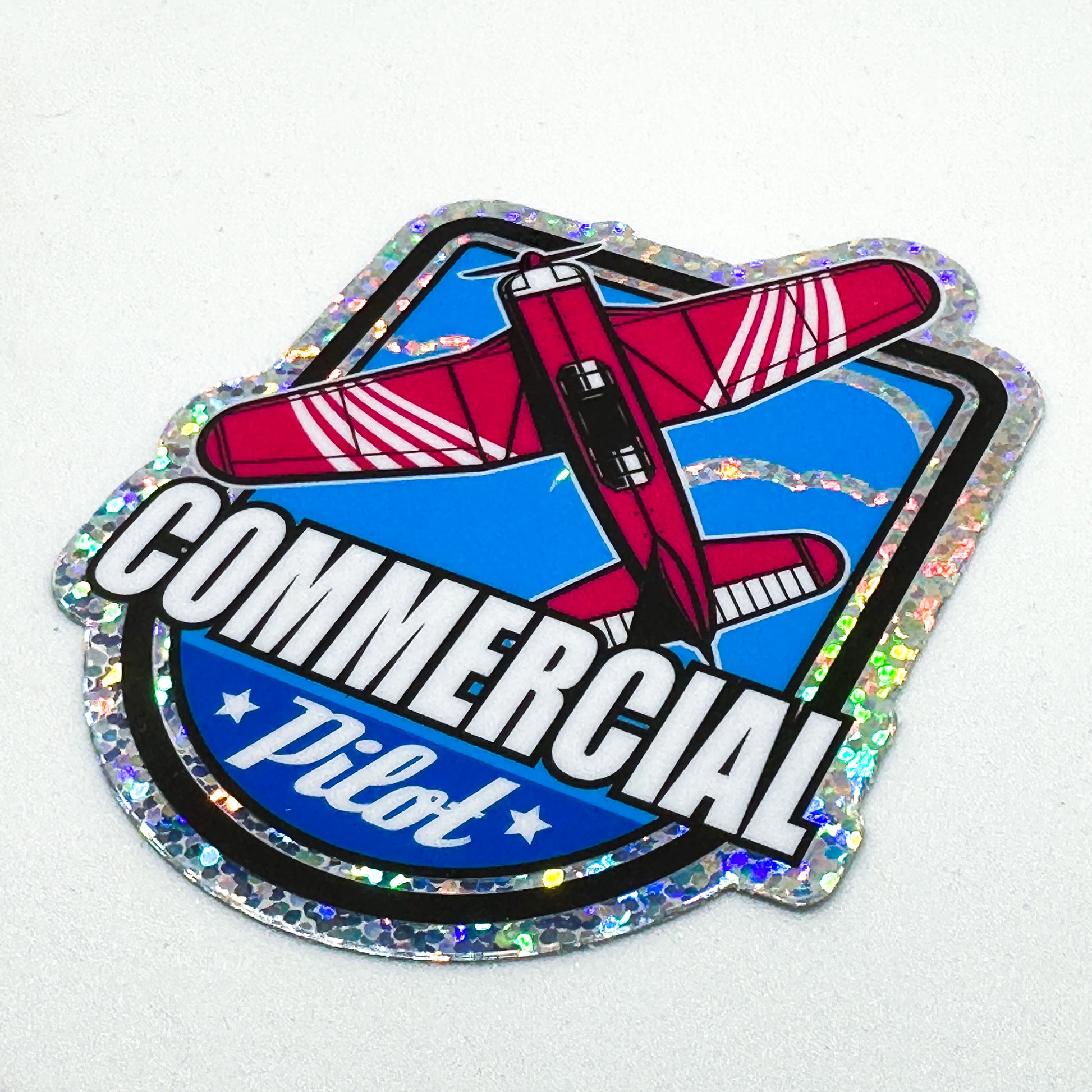 Celebrate your successful checkride (or your years of experience!) as you watch the glitter catch the light on this Commercial Pilot sticker. Also a great little gift for a newly-minted commercial pilot.