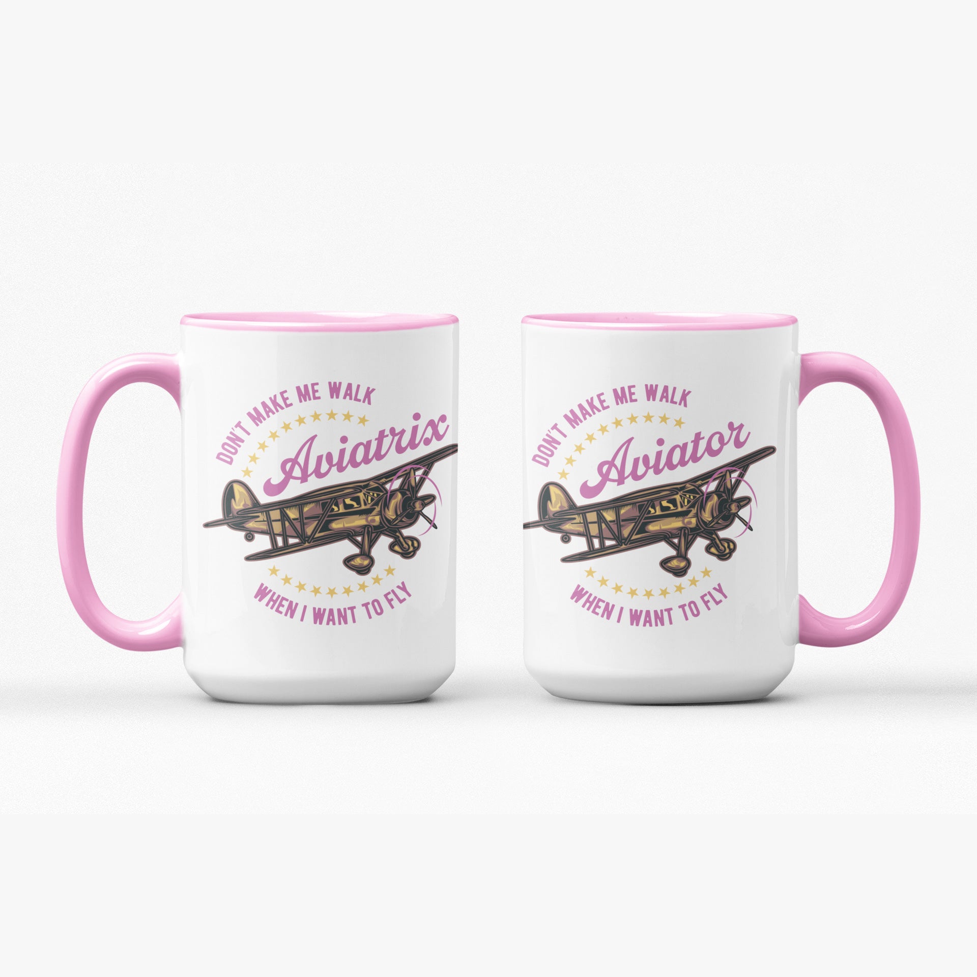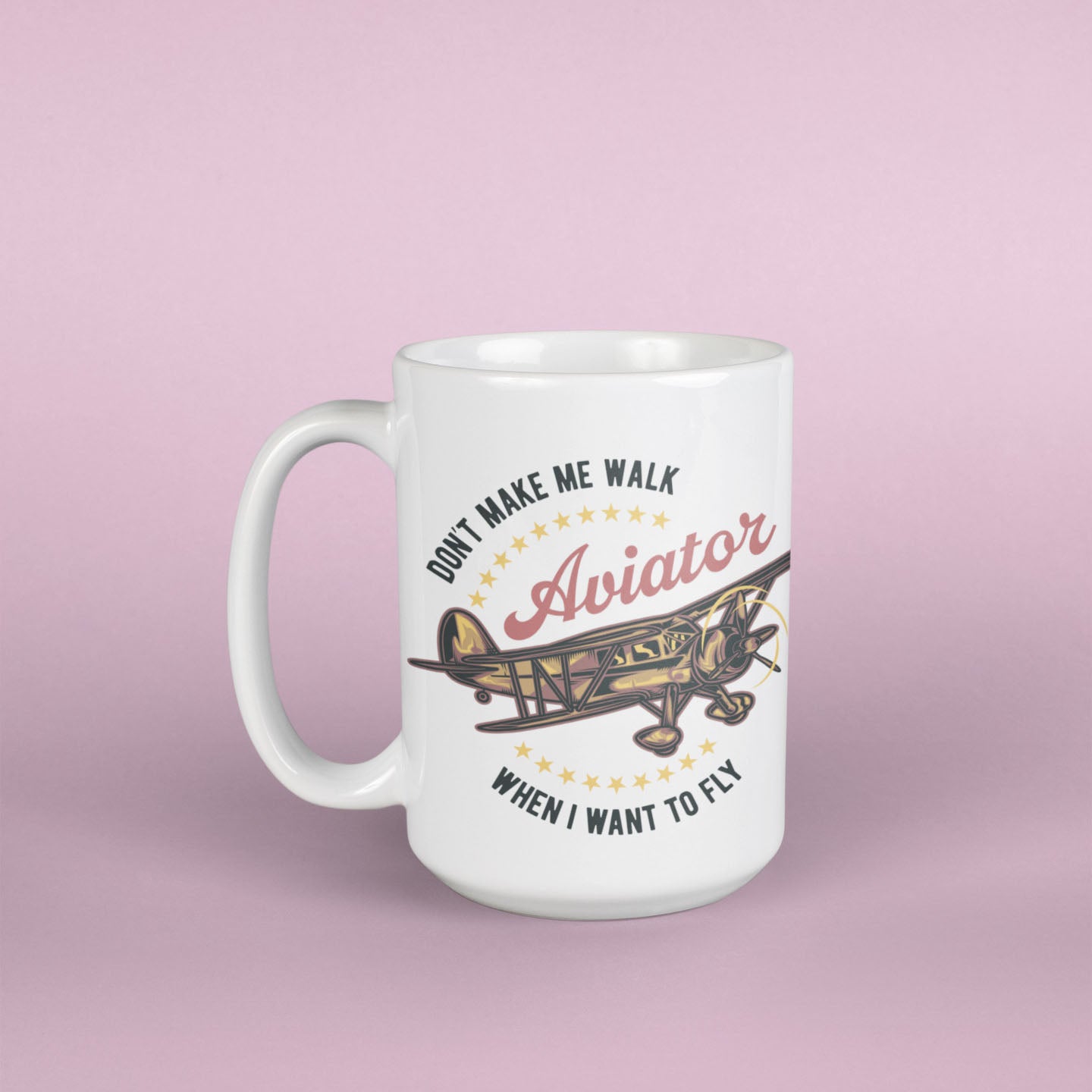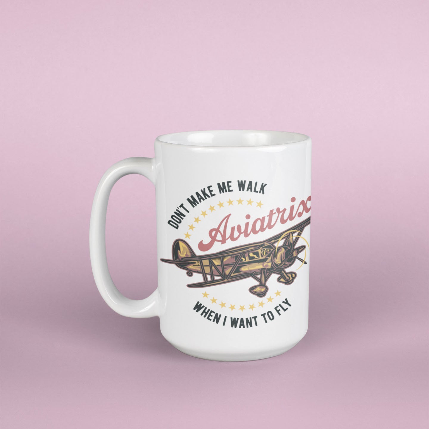 Large size (15 oz) durable ceramic mug with a feminine Aviatrix or applicable-to-all Aviator designation and your choice of a rustic, early biplane aircraft on an all-white of blue or pink accented 15 oz. ceramic mug. Hand-printed in our hangar in Southern California. Makes a great gift for a pilot friend or treat yourself!