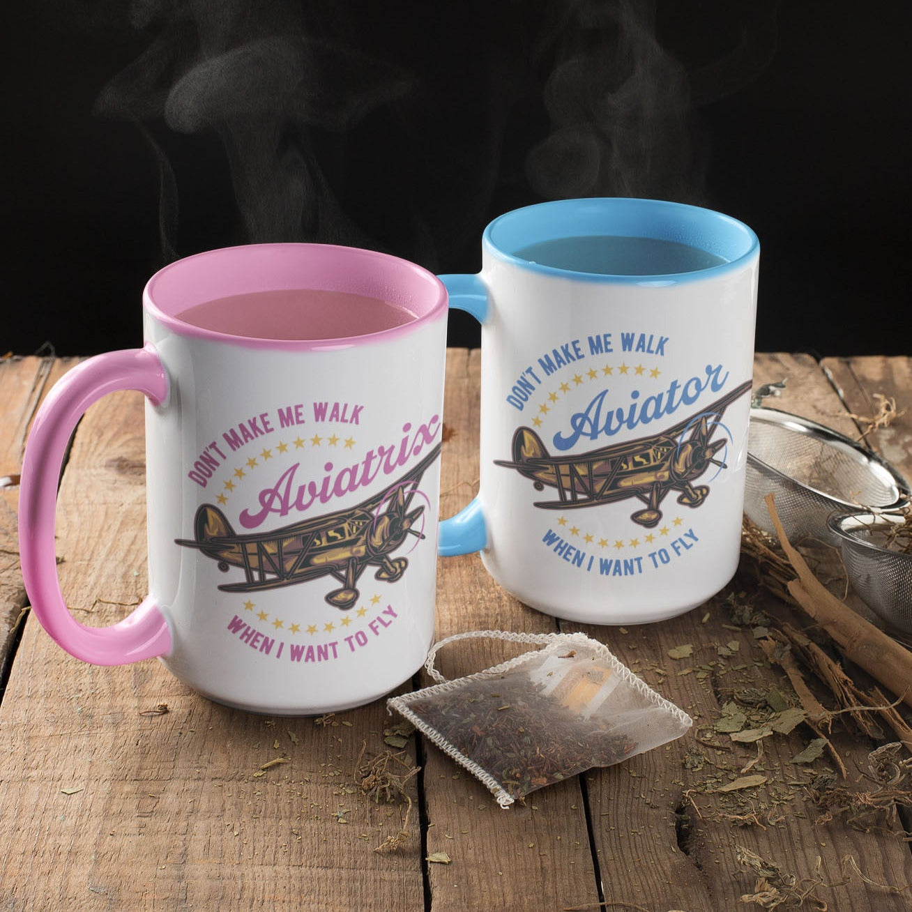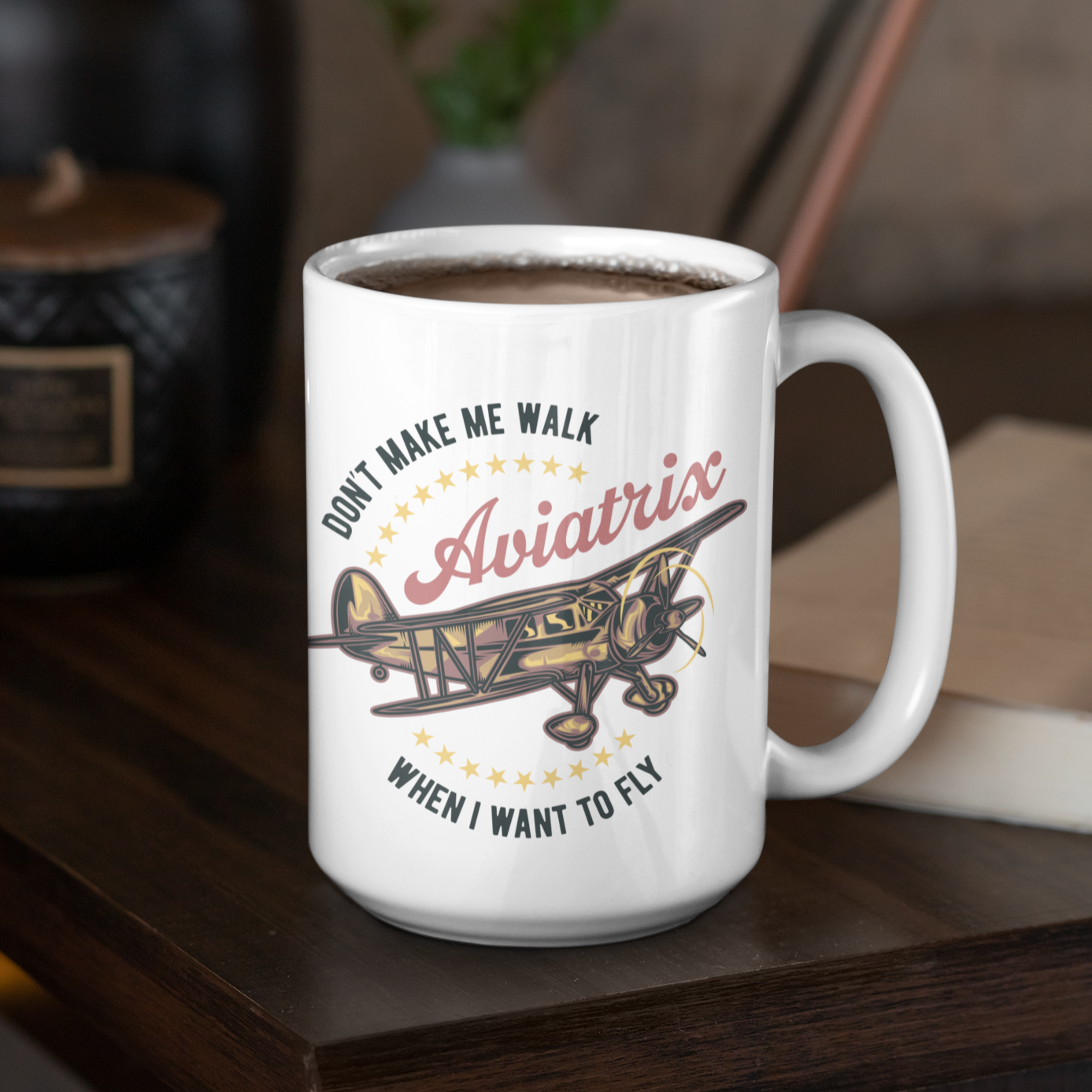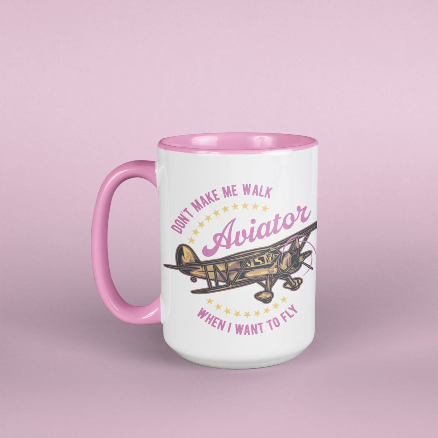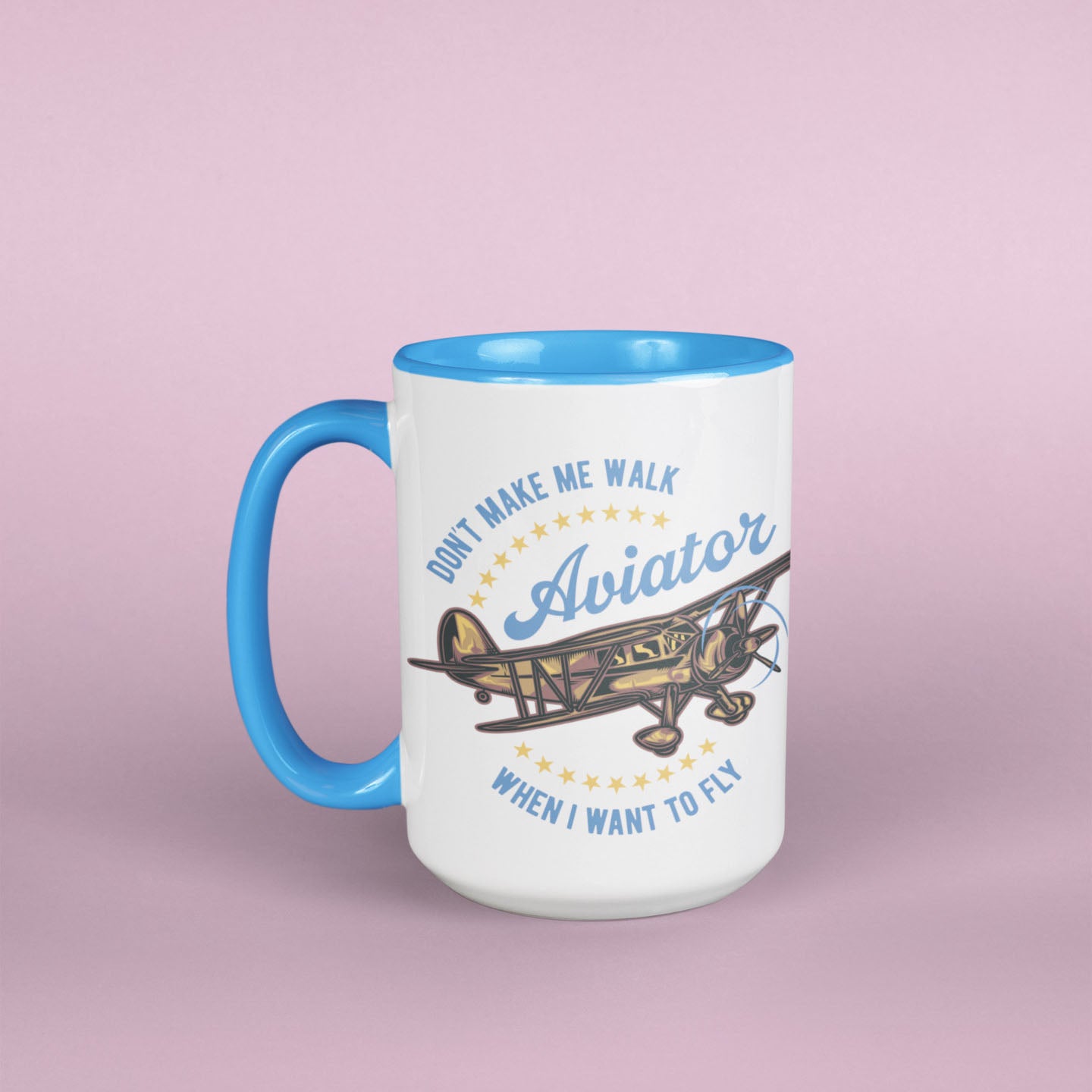 Large size (15 oz) durable ceramic mug with a feminine Aviatrix or applicable-to-all Aviator designation and your choice of a rustic, early biplane aircraft on an all-white of blue or pink accented 15 oz. ceramic mug. Hand-printed in our hangar in Southern California. Makes a great gift for a pilot friend or treat yourself!