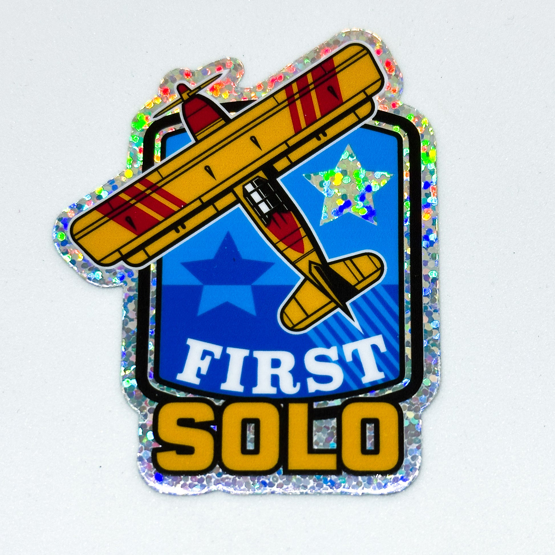 The coolest pilot on the field is the one who just SOLOED! It is such an accomplishment to fly a plane by yourself for the very first time. Celebrate that feeling every time you watch the glitter catch the light on this First Solo sticker.