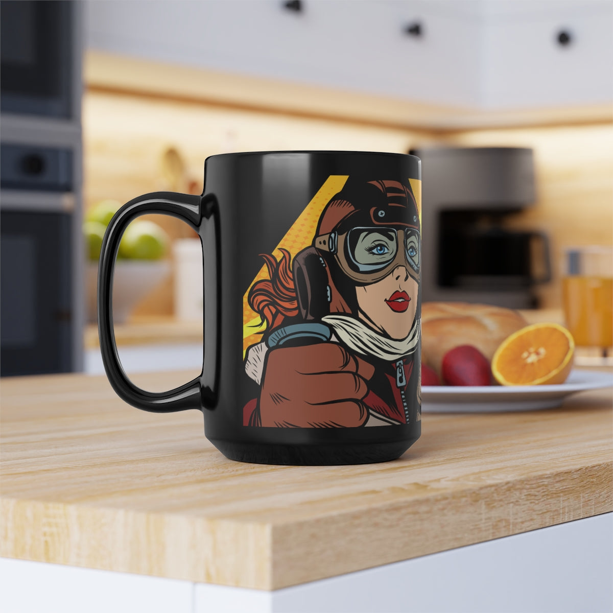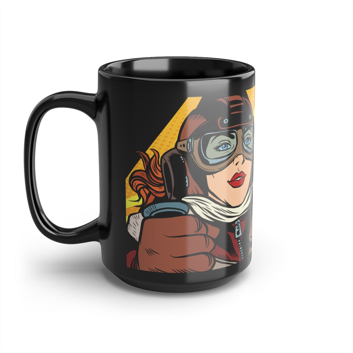 Large size (15 oz) durable ceramic mug in the always fashionable black color with our "Fly the Plane" aviatrix sublimation print wrapped around. It would make an appreciated pilot gift or thank you for a valued instructor or mechanic.