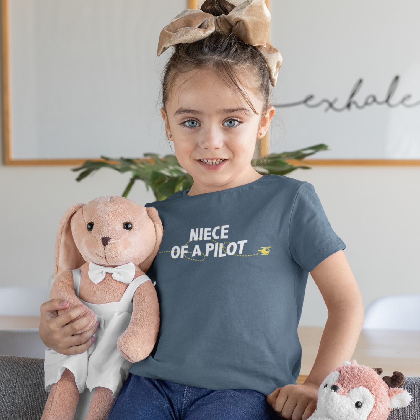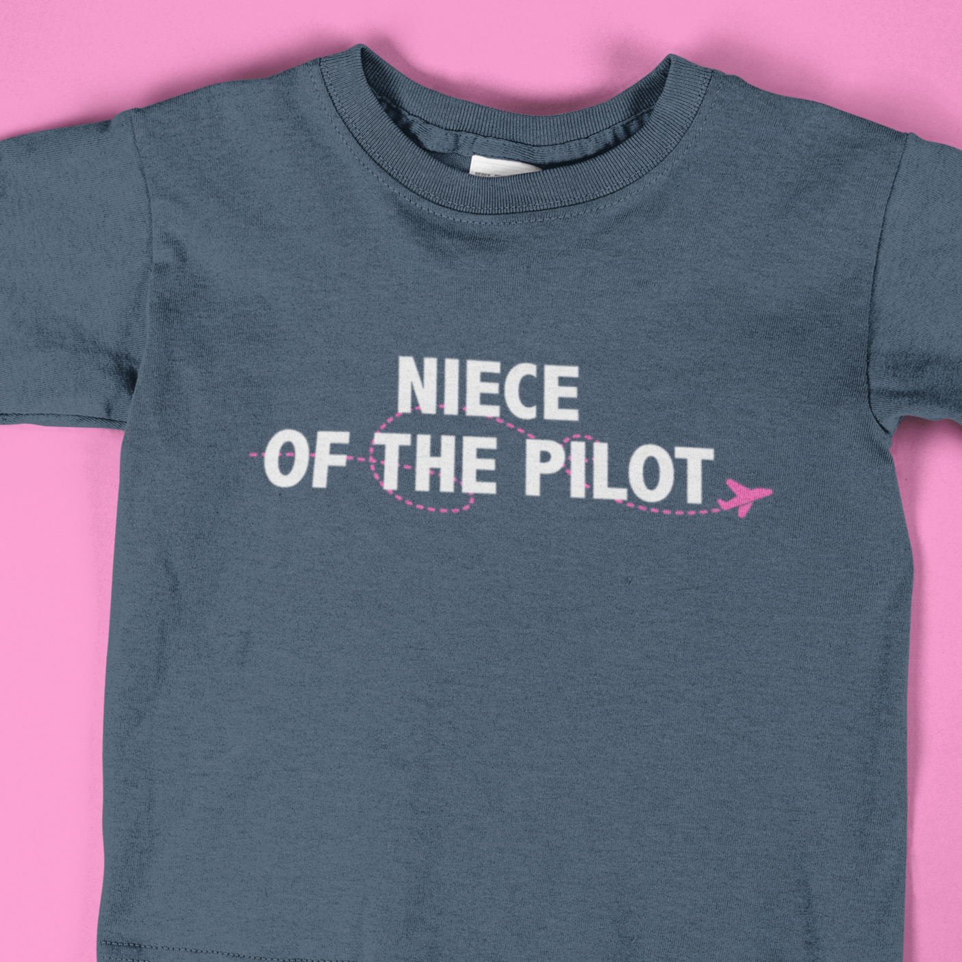 Choose a small plane, a jet plane or a helicopter in either a pink or yellow accent under white text. Featuring a cozy and comfortable poly-cotton blend in a blue-gray Indigo color with a unisex fit, this tee might be worn more than just one flight. Every flight.... or every day you share how proud you are to know a pilot!