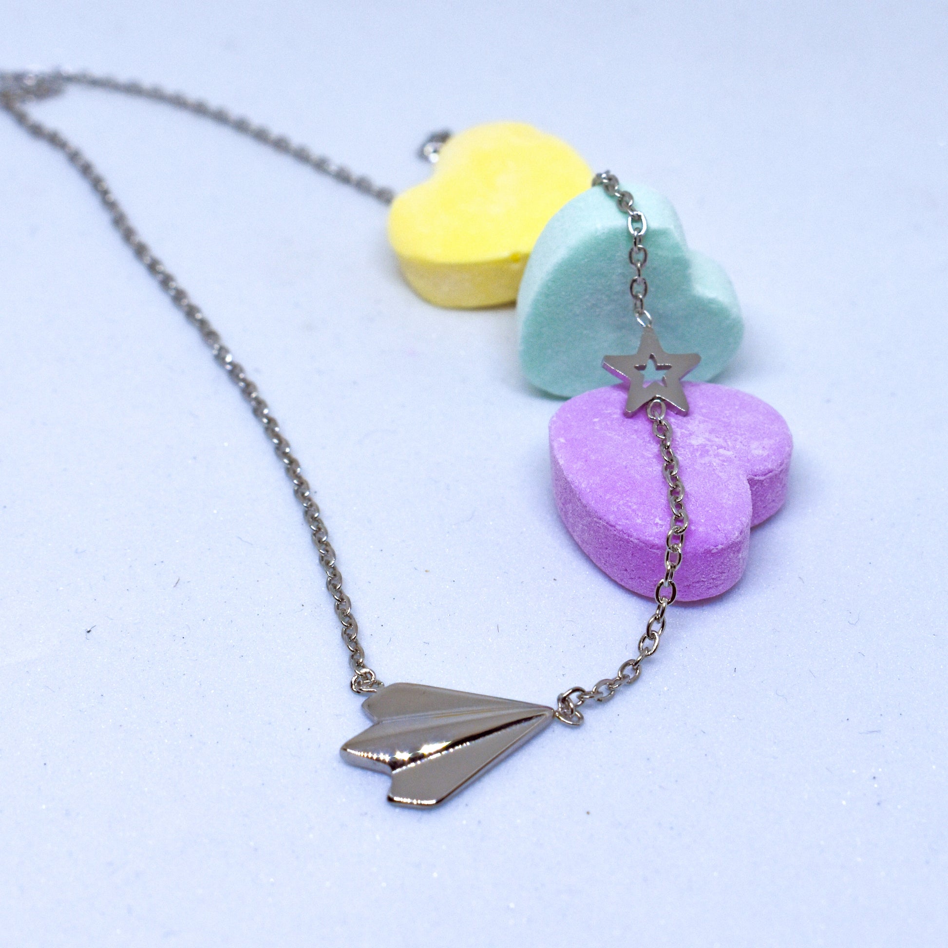 A paper airplane chases the outline of a shining star, aiming to soar higher into the sky just like you do. A cute, feminine necklace with a subtle nod to your love of the sky, it is sure to get compliments. It is available in gold, silver or rose gold, so pick your or your aviatrix's favorite color to match wardrobe or mood.