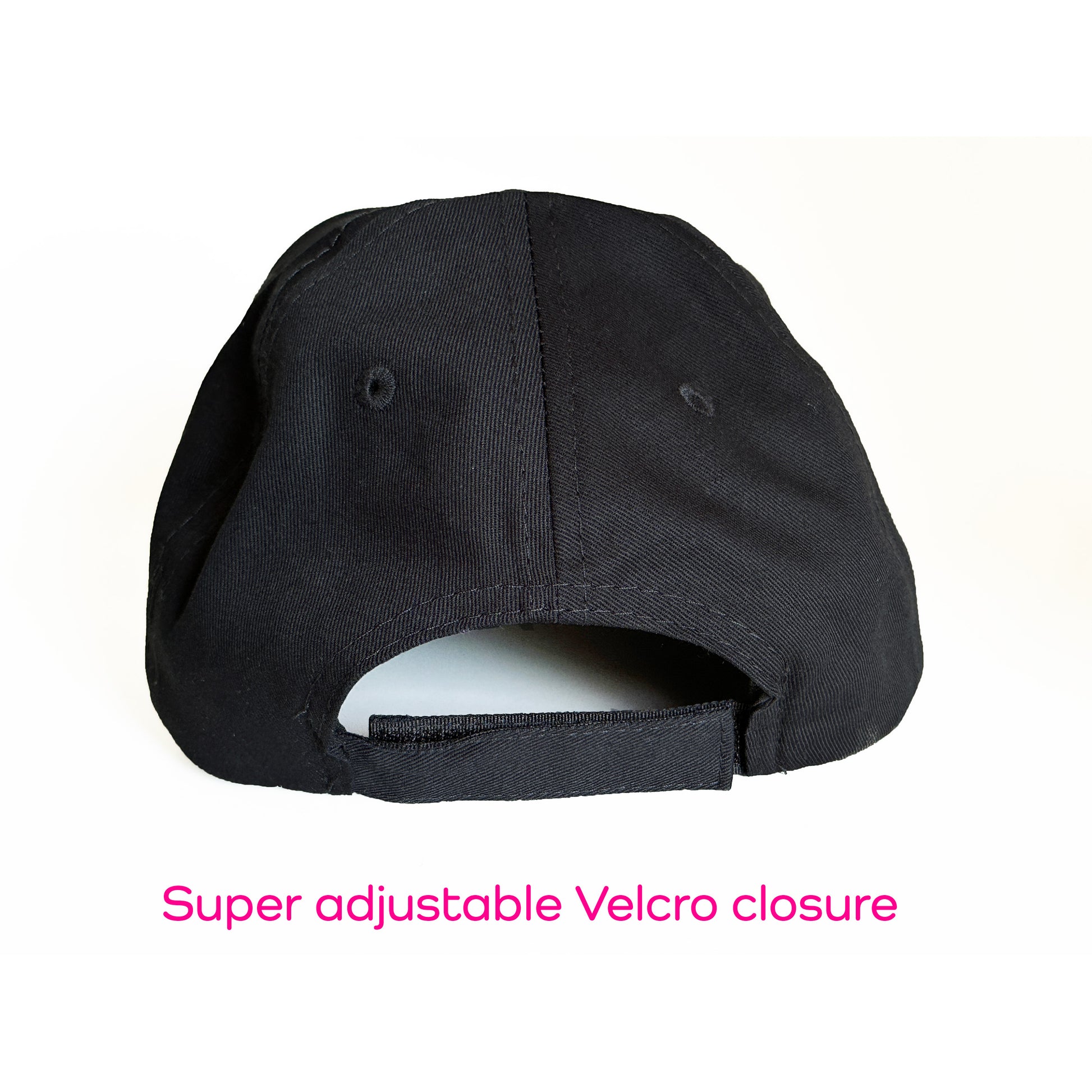 This comfy black hat is made out of 100% cotton. The 6-panel cap offers a light feel, while the adjustable Velcro strap ensures a solid and comfortable fit. Design is embroidered in white/pink as shown.