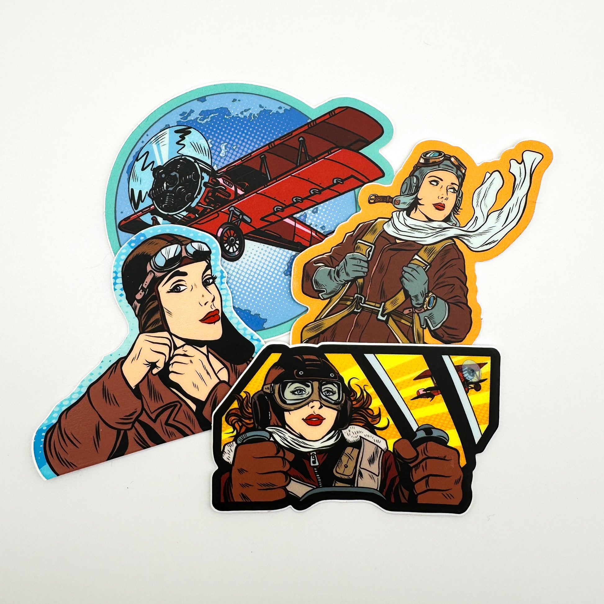 Our set of four Pop Art Aviatrix female pilot stickers harkens back to earlier times, but hopefully inspires you to soar to great heights like the early female pilot pioneers. Perfect decoration for your laptop, tablet, notebook or water bottle.