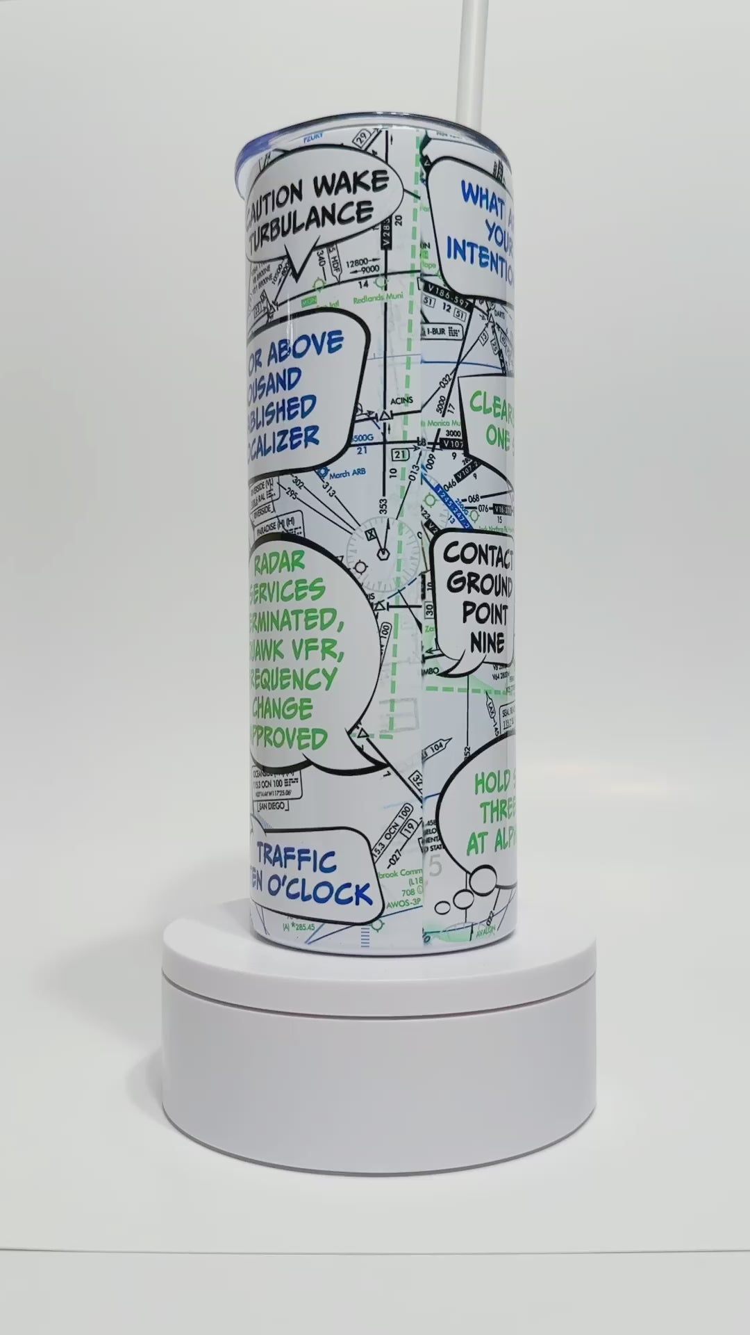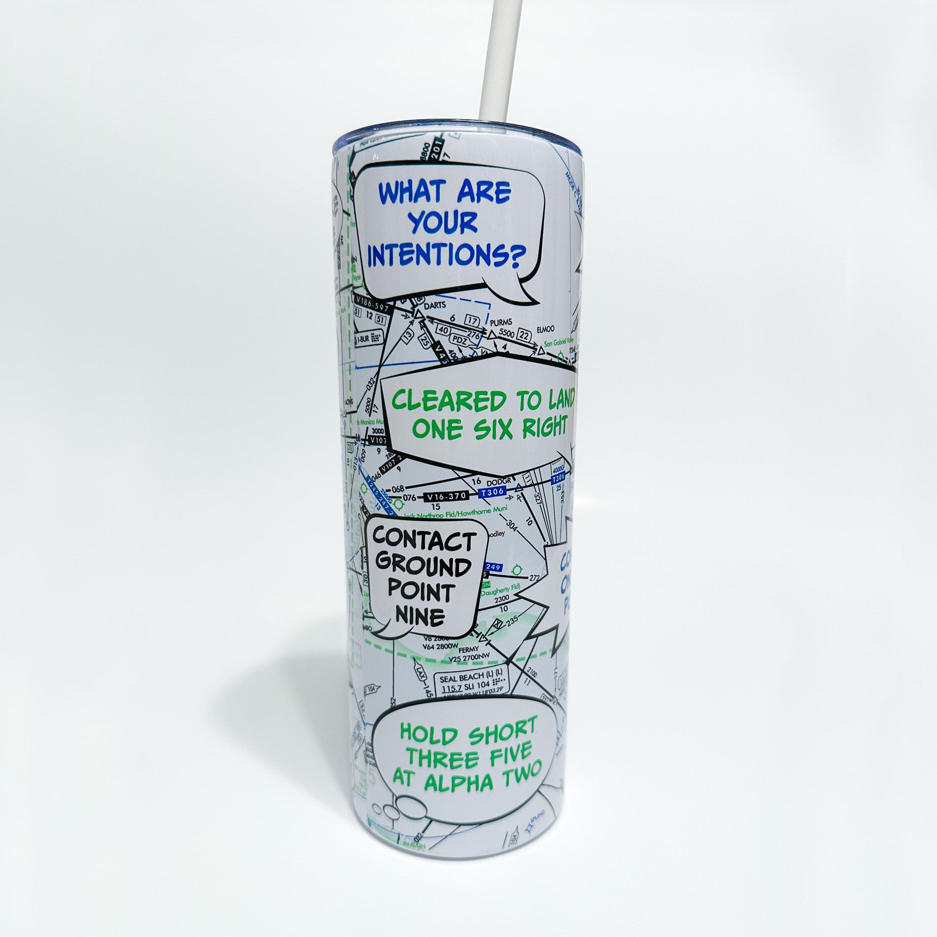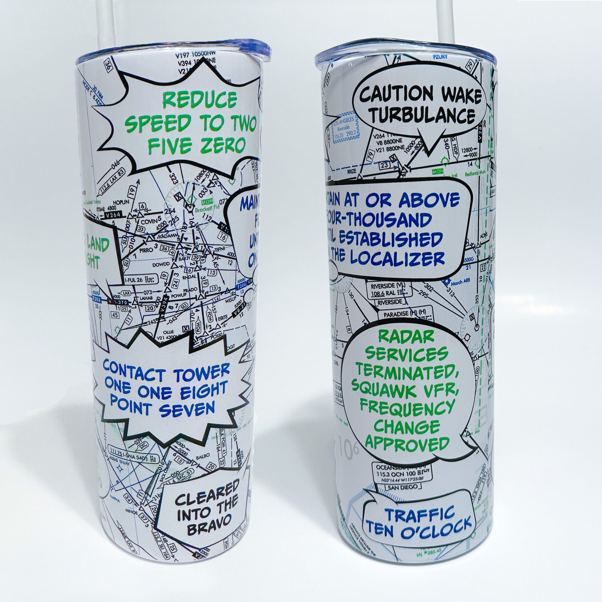 Our 'Say Again?' 20 oz stainless steel, double walled skinny tumbler is the bomb. Our custom design features common ATC instructions in speech bubbles floating over a low-altitude chart. We bet you'll catch other pilots' eyes while you sip your favorite beverage.
